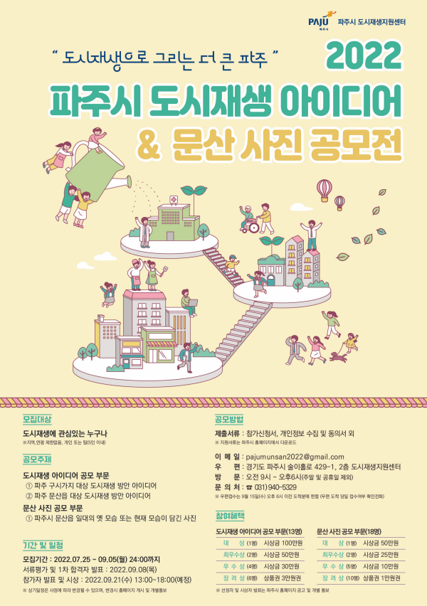 이번 공모전은 파주시 도시재생에 대해 시민의 시각으로 새로운 방향과 대안을 제시하고 함께 고민하기 위해 마련됐으며 파주시 도시재생에 관심이 있는 파주시민 및 국민 누구나 도시재생 ‘아이디어’와 ‘사진’ 2개 부문에 참여할 수 있다.