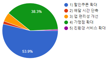 이 밖에 소비자들은 배달특급이 개선 및 확대해야 할 사항에 대해 53.9%가 “할인쿠폰 확대”를 꼽았고 38.3%는 “가맹점 확대”고 대답하면서 배달특급의 발전 방향을 제시하기도 했다.