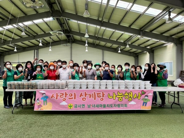 이 날 행사에서 남·녀 새마을지도자는 정성스럽게 준비한 삼계탕을 금사면 18개 리 각 마을 별 10가구에 배달했으며 이웃을 위한 따뜻한 마음을 느낄 수 있는 시간으로 채워졌다.