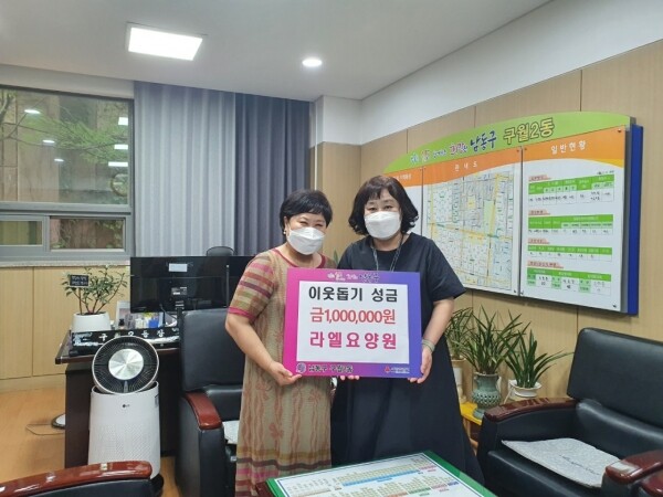 이은미 구월2동장은 “라엘요양원의 지역사회 나눔 및 이웃사랑에 감사드리며 전달해주신 기부금은 도움이 필요한 주민들을 위해 쓰일 수 있도록 노력하겠다”고 전했다.