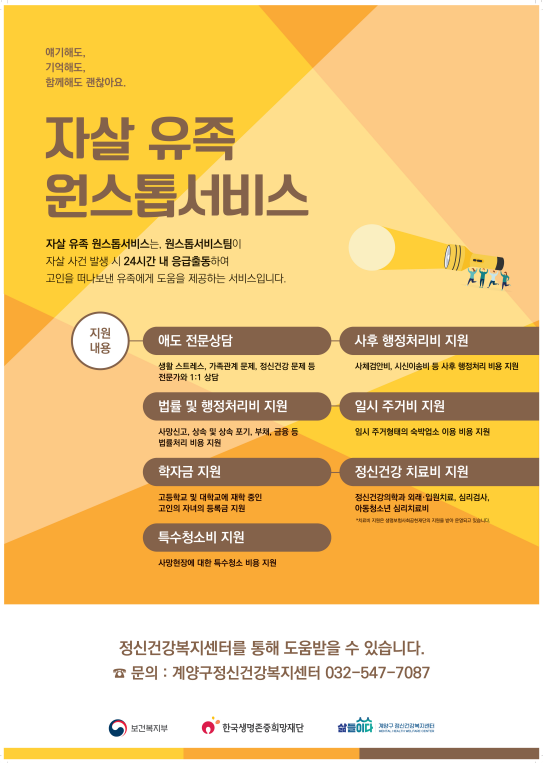 계양구에 거주하는 자살사망자의 유족을 대상으로 사후 행정 처리지원 법률 및 행정처리 지원 일시 주거 지원 특수 청소 지원 학자금 정신건강 치료비 지원 등을 지원할 예정이다.