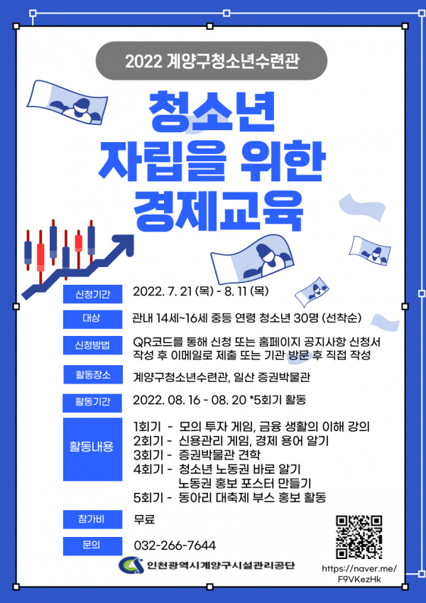 ‘청소년 자립을 위한 경제교육’ 프로그램은 계양구 관내 14세~16세 중등 연령 청소년을 대상으로 학교, 가정, 학원 등에서 배울 수 없는 경제교육을 통해 청소년들의 실질적이고 실용적인 경제 능력을 높이고자 마련됐다.