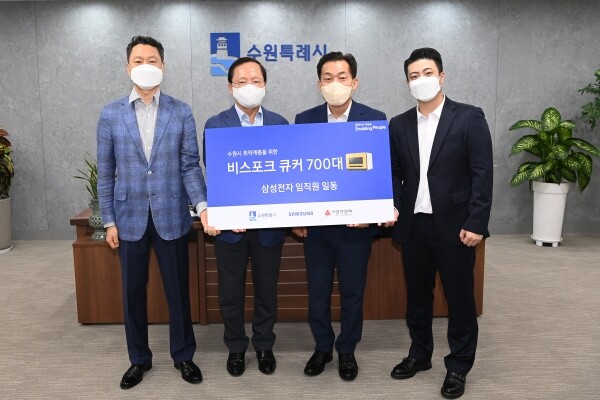 박학규 삼성전자 사장을 비롯한 임직원들은 27일 오후 4시 이재준 수원특례시장 집무실을 방문해 삼성전자에서 생산한 다용도 조리 기기 700대를 수원시에 기증했다.