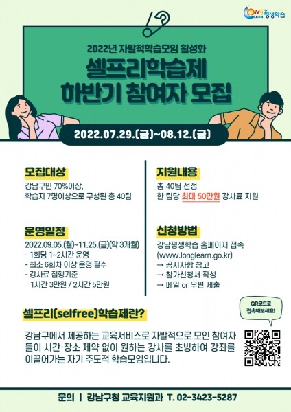 셀프리는 ‘self’와 ‘free’의 합성어로 셀프리학습제는 지역 인적자원 개발과 생활 속 학습문화 조성을 위해 주민이 자발적으로 모여 공부하는 모임에 강사료를 지원하는 강남구만의 교육서비스다.