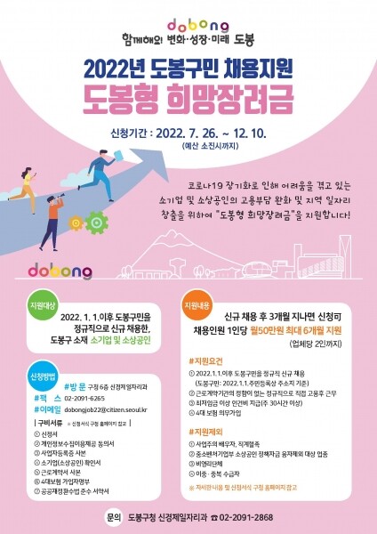 지역 내 소기업 및 소상공인으로서 올해 도봉구민을 정규직으로 신규 채용해 3개월이 지난 경우 신청 가능하다.