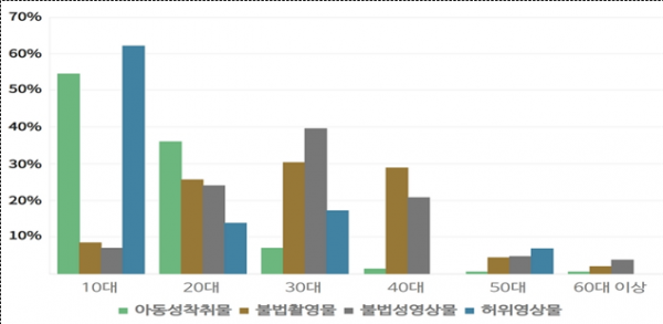 10~20대 피의자는 아동성착취물 범죄에서 30∼40대 피의자는 불법촬영물·불법성영상물 범죄에서 범행 비중이 높았으며 50대 이상부터는 모든 범죄 유형에서 차지하는 비중이 작았다.