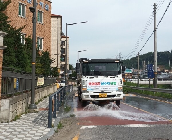 연일 30도를 넘는 폭염 특보발령이 이어지고 있는 가운데 도로 복사열 감소와 인명피해 예방을 위해 지난 27일부터 유동인구가 많은 태전지구를 중심으로 살수차 운영을 시작했다.