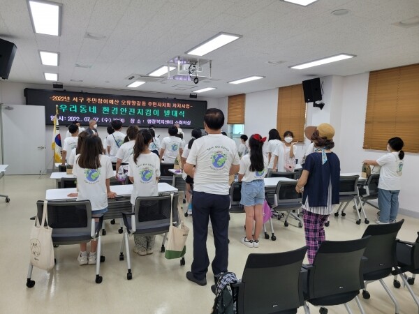 학생들은 이날 발대식에 앞서 오류왕길동 행정복지센터 주변을 중심으로 쓰레기를 주우며 환경 정화 활동을 펼쳤고 참여 소감문 작성과 우리의 각오를 낭독하며 실천하는 환경안전지킴이가 되겠다고 다짐했다.