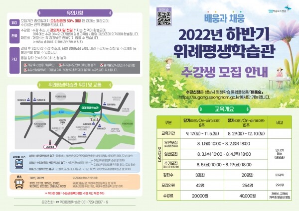 수강 신청은 오는 8월 1일부터 19일까지 성남시 평생학습 통합플랫폼 배움숲을 통해 이뤄진다.