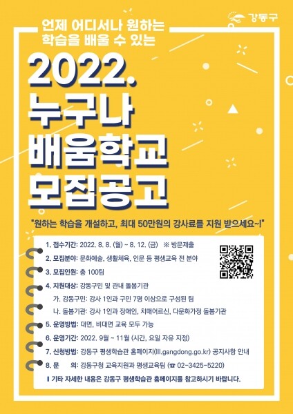 이수희 강동구청장은 “누구나 배움학교를 통해 주민들이 언제 어디서나 배움의 기쁨을 누릴 수 있는 시간이 되길 바란다”며 “앞으로도 배움을 원하는 주민 누구에게나 평생학습 참여 기회가 주어질 수 있도록 적극 지원해나가겠다”고 밝혔다.