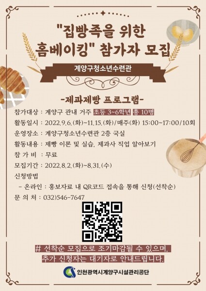 대상은 계양구 관내 거주 또는 재학 중인 초등 3~6학년 청소년을 선착순으로 모집해, 오는 9월 6일부터 11월 15일까지 매주 화요일 오후 3시~5시까지 총 10회 운영될 예정이며 참가비는 무료이다.