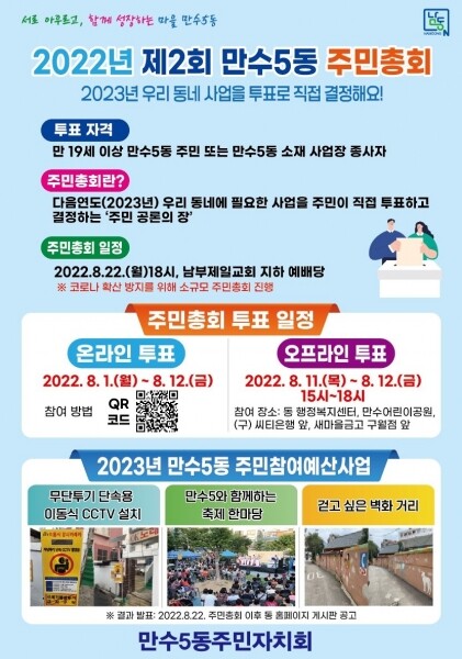 주민총회에 상정된 마을 의제는 무단투기 단속용 이동식 CCTV 설치 만5와 함께하는 축제 한마당 걷고 싶은 벽화 거리 등 모두 3건으로 투표 결과에 따라 8월 22일 열리는 만수5동 주민총회에서 추진 여부가 결정된다.