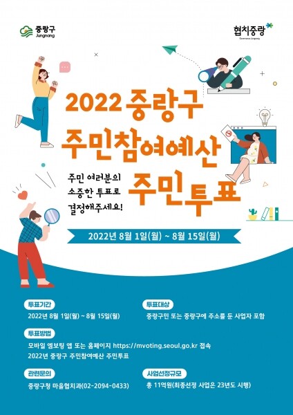 류경기 중랑구청장은 “매년 운영하는 주민참여예산제도에서 주민 여러분이 제안하는 다양하고 창의적인 의견을 적극 수렴해 지역발전과 생활불편사항 등을 해결해 나가겠다”며 “내년도 예산편성에 주민 의견이 적극 반영될 수 있도록 많은 관심과 참여를 부탁드린다”고 말했다.