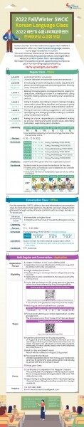 수원시 거주 외국인이 수강할 수 있는 ‘2022년 하반기 한국어 교실’은 정규반 6개 반과 회화반 1개 반을 운영한다.