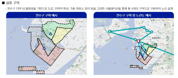 연수구 지역 내 물동량을 기반으로 도로·지역적 특성·가용 정류소 위치 등을 고려한 시뮬레이션을 통해 총 4개의 구역으로 구분해 노선을 설계했다.
