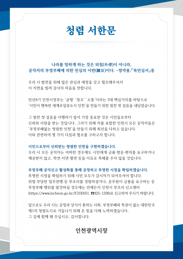‘청렴 서한문’에서 유 시장은 “우리 시의 모든 공직자는 ‘부정부패 없는 청렴한 인천’을 만들기 위해 끊임없이 노력하고 있으며 앞으로도 공정과 상식이 통하는 사회, 부정부패와 특권이 없는 대한민국 제1의 청렴도시로 거듭나기 위해 노력하겠다”고 전했다.