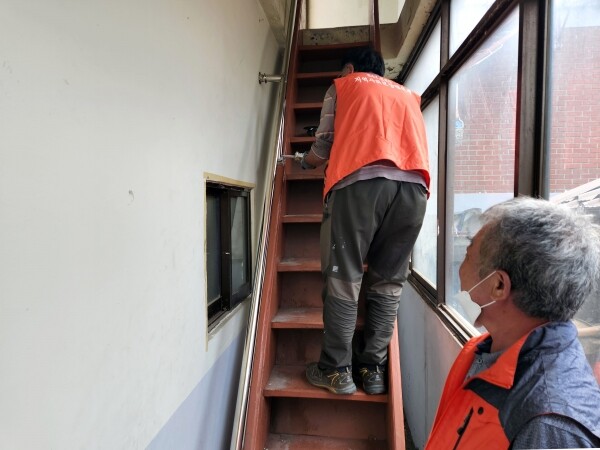 이날은 거동이 불편한 어르신의 안전을 위해 지역사회보장협의체 위원이 직접 계단에 안전바를 설치해 어르신이 안전하게 계단을 이동할 수 있도록 도왔다.