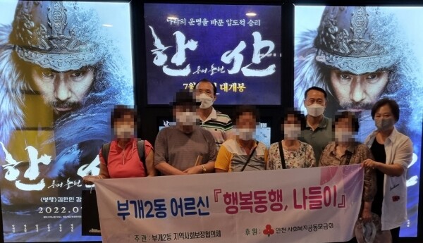 이번 ‘영화나들이’에서는 협의체 위원 2명과 노인 3명이 조를 이뤄 위원들의 인솔 하에 영화 ‘한산’을 관람하고 식사와 함께 담소를 나누는 시간을 가졌다.