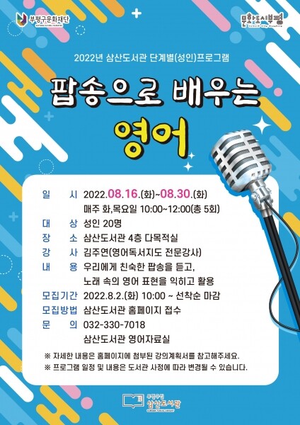 배창섭 부평구립도서관 본부장은 “주민들에게 익숙한 팝송을 활용하는 이번 교육을 통해 영어에 대해 더 쉽게 접근할 수 있는 기회가 되길 바란다”며 “앞으로도 삼산도서관은 영어특성화 도서관으로서 다양한 영어 프로그램을 마련할 것”이라고 말했다.