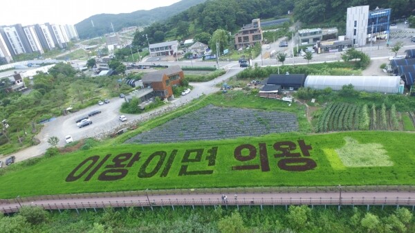 백운호수 근처 학의동 500번지 일대에 조성된 벼아트는 ‘U-덕분에♥’, ‘이왕이면 의왕’을 자색벼, 적색벼 등 다양한 색깔 벼로 표현해 도심 속 농촌경관이 조화를 이룬 모습이 장관을 이루고 있다.
