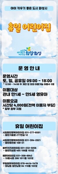 휴일 어린이집은 시립동탄행복어린이집, 시립영천행복어린이집, 블루키즈어린이집, 예쁜어린이집, 우림필유어린이집 총 5개소에서 이용 가능하다.
