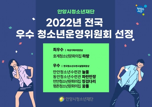 재단은 이번 평가에서 호계청소년문화의집 청소년운영위원회 ‘하랑’ 이 최우수상에 이름을 올려 여성가족부장관상을, 이 밖에도 만안청소년수련관 ‘늘품’ 동안청소년수련관 ‘파란만장’ 만안청소년문화의집 ‘징검다리’ 평촌청소년문화의집 ‘꿈틀’ 이 우수 청운위에 선정돼 한국청소년수련시설협회장상을 수상하게 됐다.