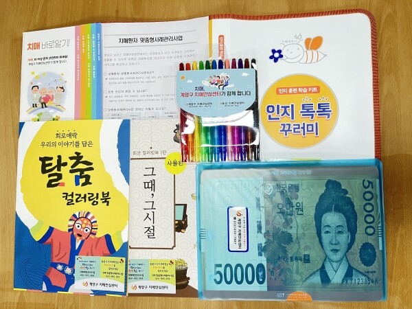 인지강화키트에는 치매환자의 인지단계에 맞는 퍼즐·색칠하기·색연필 등의 교구가 들어있어 대상자가 가정에서 인지훈련을 통해 기억력 유지·증진에 도움이 되도록 했다.
