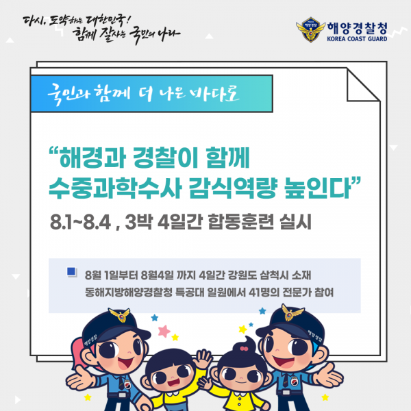 김광식 경찰청 과학수사관리관은 “이번 훈련으로 경찰의 과학적 증거수집 기술과 해경의 뛰어난 수중 수색 기술을 공유하게 되어 뜻깊게 생각하며 수중과학수사 역량 강화를 위해 해경과의 합동 교육·훈련을 지속적으로 펼쳐나가겠다”고 밝혔고 김성종 해양경찰청 수사국장은 “해양 사건·사고에 대한 수중과학수사 전문기관으로서의 역량을 갖추고 수중감식 기법 공유와 협력체계 구축을 위해 유관기관 간 수중과학수사 합동훈련을 연례화하겠다”고 밝혔다.
