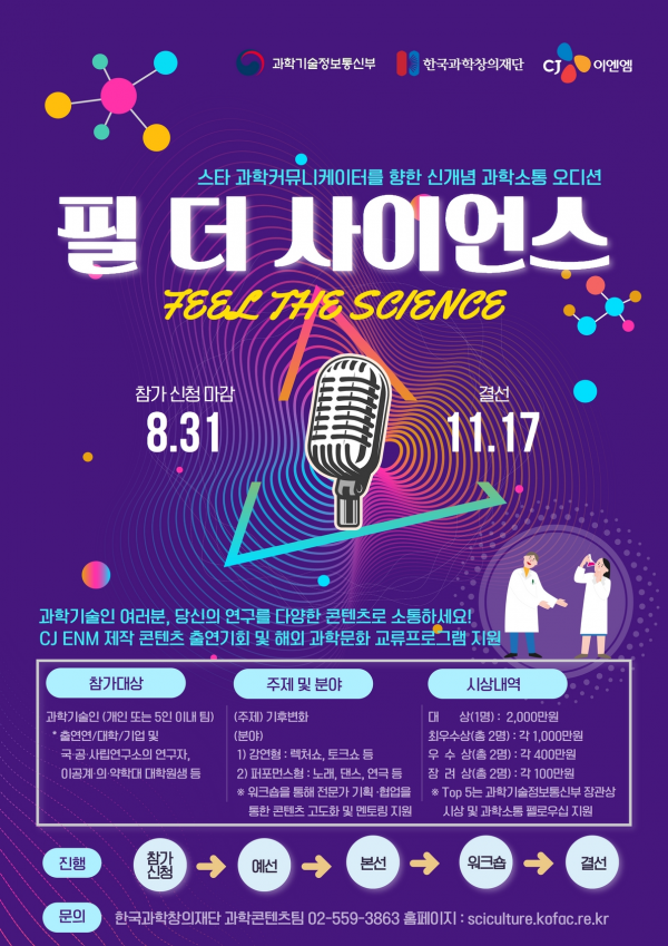 올해 ‘필 더 사이언스’ 경연은 ‘기후변화’를 주제로 총상금 5천만원을 놓고 진행하며 과학기술분야 출연, 대학, 기업 등 국·공·사립 연구소의 연구자 뿐만 아니라 이공계 대학원생 등 과학기술인이라면 누구나 참여 가능하다.