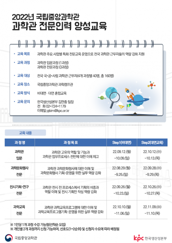 과학관 전문인력양성 사업은 전국 국·공·사립 과학관 근무자 등을 대상으로 비대면과 대면의 융합교육 형태로 운영하며 오는 8월 3일부터 총 4개 과정에 160명의 교육생을 모집한다.