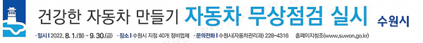 참여업체 명단 등 자세한 내용은 수원시 홈페이지 ‘시정소식’에 게시된 ‘2022년 자동차 무상점검 실시 안내’에서 확인할 수 있다.