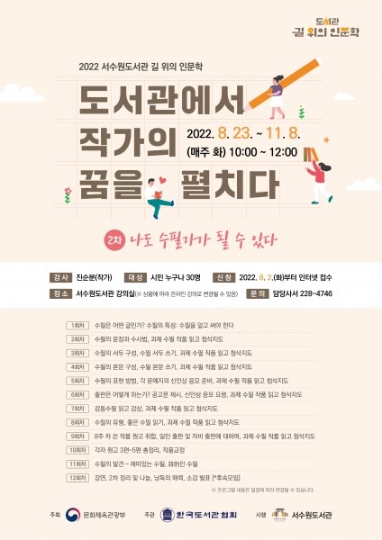 ‘나도 수필가가 될 수 있다’ 프로그램은 8월 23일부터 11월 8일까지 매주 화요일마다 오전 10시부터 2시간 동안 서수원도서관 강의실에서 진행된다.
