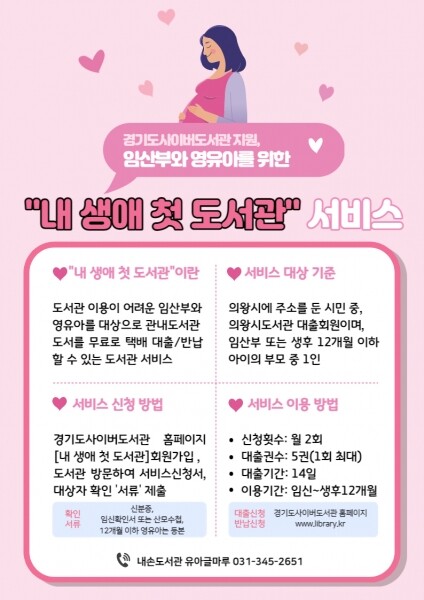 이경미 도서관운영과장은 “임신으로 거동이 불편하고 어린아이와 함께 도서관을 방문하기 어려운 가정에 직접 책을 보내는 서비스를 통해 출산과 육아, 지역 독서문화 확산에 도움이 되기를 바란다”고 말했다.