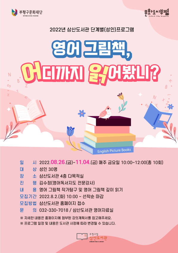 배창섭 부평구립도서관 본부장은 “이번 프로그램으로 영어 그림책의 숨겨진 매력을 발견하고 다양한 작가의 작품을 접할 수 있는 기회가 되길 바란다”며 “앞으로도 삼산도서관이 지역주민들의 문화적 성장을 돕는 공간이 될 수 있도록 최선을 다할 것”이라고 말했다.