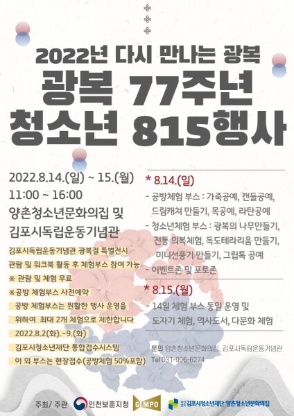 8월 14일과 8월 15일 이틀 간 운영되는 이번 행사는 지역사회의 광복절 경축 분위기를 조성하고 청소년과 시민들의 자긍심과 애국심을 고취 할 수 있도록 청소년, 시민 모두가 함께하는 행사로 마련했다.