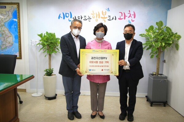 한편 과천시는 이날 전달받은 기부금 1천만원은 경기사회복지공동모금회를 통해 도움이 필요한 지역 내 취약계층을 위해 사용할 계획이라고 전했다.