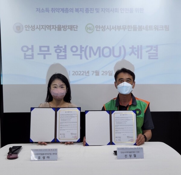신상철 안성시지역자율방재단장은 “업무협약을 밑그림 삼아, 저소득 취약계층을 위한 지원과 안전한 안성시 환경 조성에 최선을 다하겠다”고 소감을 전했다.