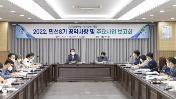 이번 보고회는 윤환 계양구청장을 비롯한 간부공무원 20여명이 참석한 가운데 민선8기의 정책방향을 설정하고 공약사항을 성실히 이행하기 위한 추진계획을 검토하는 한편 올해 주요 추진 사업에 대한 중간평가를 통해 문제점과 개선방안을 논의하는 시간을 가졌다.