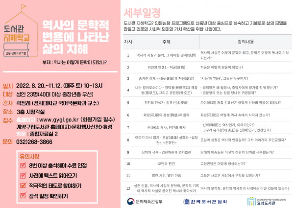 도서관 관계자는 “수강생들이 인문학적 성찰을 통해 개인의 삶의 질 향상과 더불어 행복한 사회공동체를 형성하는 데 기여하길 바란다”고 전했다.