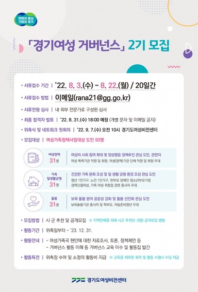 경기도여성비전센터가 운영하는 ‘경기여성 거버넌스’는 여성가족정책 분야를 여성정책, 가족 일생활균형, 돌봄 등 3개 분야로 나눠 정책의 실수혜자인 도민을 활동가로 모집해 함께 대안을 모색하는 정책 참여·협력 체계다.