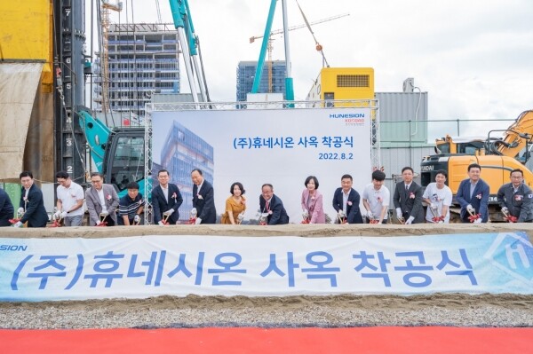 ㈜휴네시온 사옥 건설 현장에서 진행된 이날 착공식은 휴네시온 임직원 40여명이 참석해 간소하게 치러졌는데, 강동구의 자족기능 강화의 핵심인 고덕비즈밸리의 성공을 바라는 마음으로 이수희 강동구청장이 행사에 함께했다.