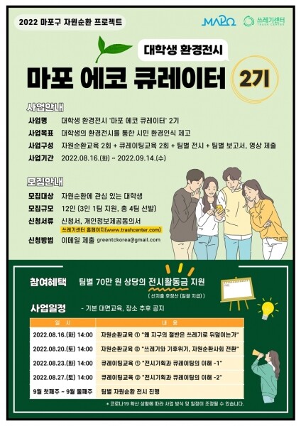 박강수 마포구청장은 “환경교육도 받고 내 손으로 직접 전시도 기획해볼 수 있는 이번 프로그램에 많은 관심 부탁드린다”며 “앞으로도 지속 가능한 마포로 나아가기 위해 구민이 공감할 수 있는 체험 위주의 환경 관련 프로그램을 운영할 예정”이라고 전했다.