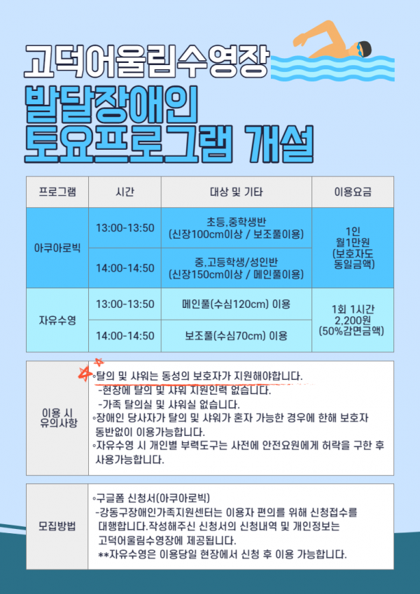운영 장소는 고덕어울림수영장으로 강동구에 거주하는 장애인 당사자나 가족이라면 누구나 신청할 수 있다.