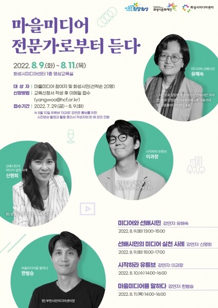 화성시미디어센터 관계자는 “이번 강연은 화성형 마을미디어 구축을 위해 나아가고 있는 ‘마을PD’와 시민분들에게 더 좋은 마을공동체를 만들어가기 위한 미디어의 역할과 과제를 함께 생각해보는 자리가 될 것”이라고 전했다.