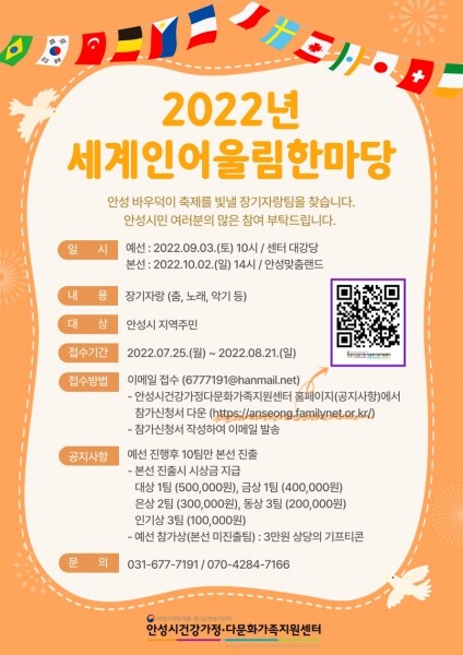 ‘2022년 세계인 어울림 한마당’은 안성시가 주최하고 안성시건강가정다문화가족지원센터에서 주관하는 행사로 안성시에 거주하고 있는 내·외국인 누구나 자신의 재능을 자랑할 수 있는 기회의 장을 마련하고 다양한 문화권의 사람들이 서로 이해하고 공존하는 사회를 만들자는 취지로 기획됐다.
