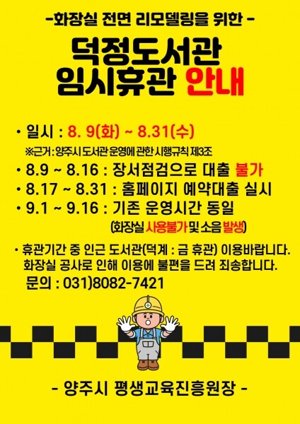 시 도서관 관계자는 “이번 화장실 리모델링 공사로 노후시설을 개선해 덕정도서관을 찾는 시민들이 쾌적한 환경 속에서 도서관을 이용할 수 있기를 바라며 공사기간 중 다소 불편하더라고 너른 양해 바란다”고 전했다.