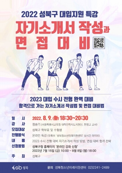 이번 대입 지원 특강은 8월 9일 18:30부터 약 2시간 동안 유튜브 실시간 라이브로 진행되며 성북구청 홈페이지 ‘온라인 강좌 신청’에서 8일 오후 6시까지 신청할 수 있다.