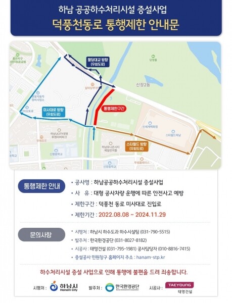 박종진 하수도과장은 “하수처리장 증설을 추진하는 과정에서 일반차량의 안전사고를 미연에 방지하기 위해 덕풍천동로의 통행을 제한하게 됐다”며 “주민들의 불편이 최소화될 수 있도록 공사 현장관리에 만전을 기하겠다”고 밝혔다.