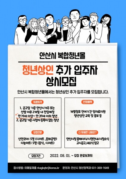 신청은 안산시 누리집에 게시된 신청서 양식을 내려받아 관련서류와 함께 이메일로 접수하면 되고 자세한 사항은 안산시 누리집에서 공고문을 참고하거나 안산시 청년정책과에 전화로 문의하면 된다.