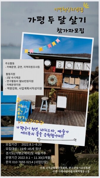 가평군을 제외한 경기도 거주 또는 서울 거주 청년이면 신청할 수 있고 신청 문의는 조합 사업단장 로 하면 된다.